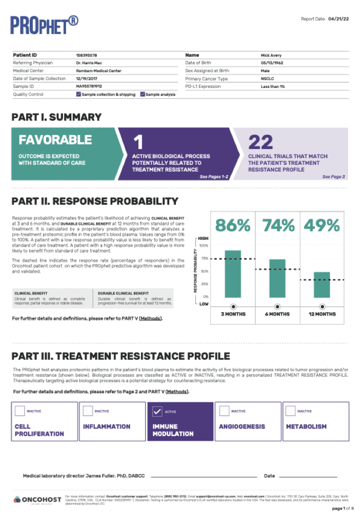 PROphet® analyzes proteomic changes in blood samples to monitor the dynamics of biological processes induced by the patient (i.e., the host) in response to a given cancer therapy. This proteomic profile is highly predictive of individual patient outcomes, thus enabling personalized treatment planning.